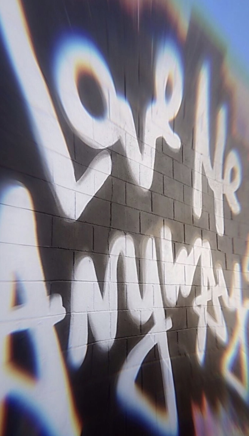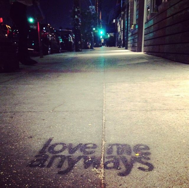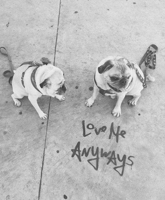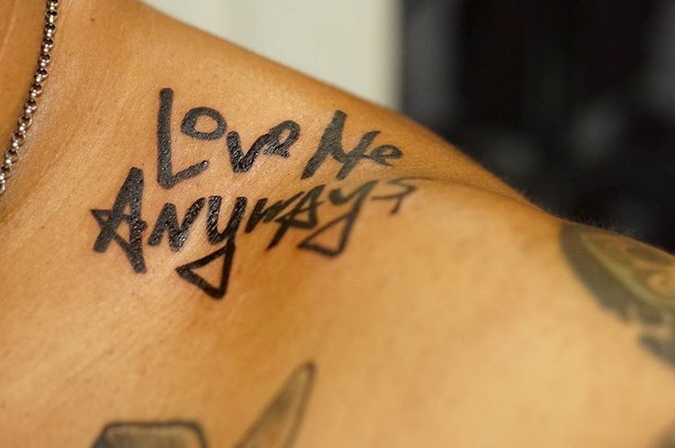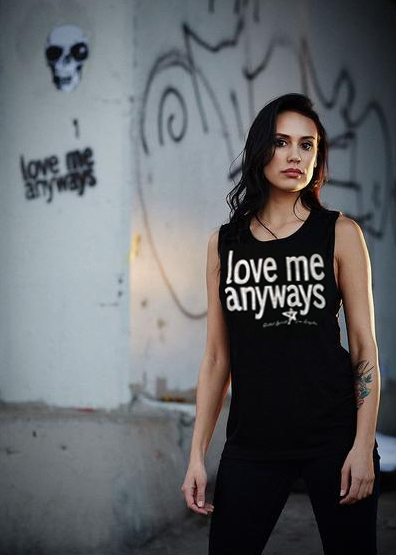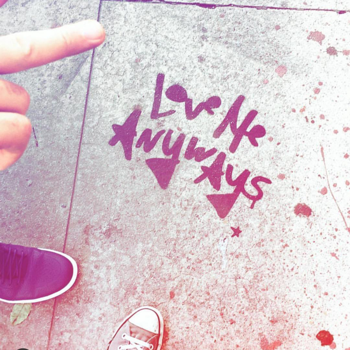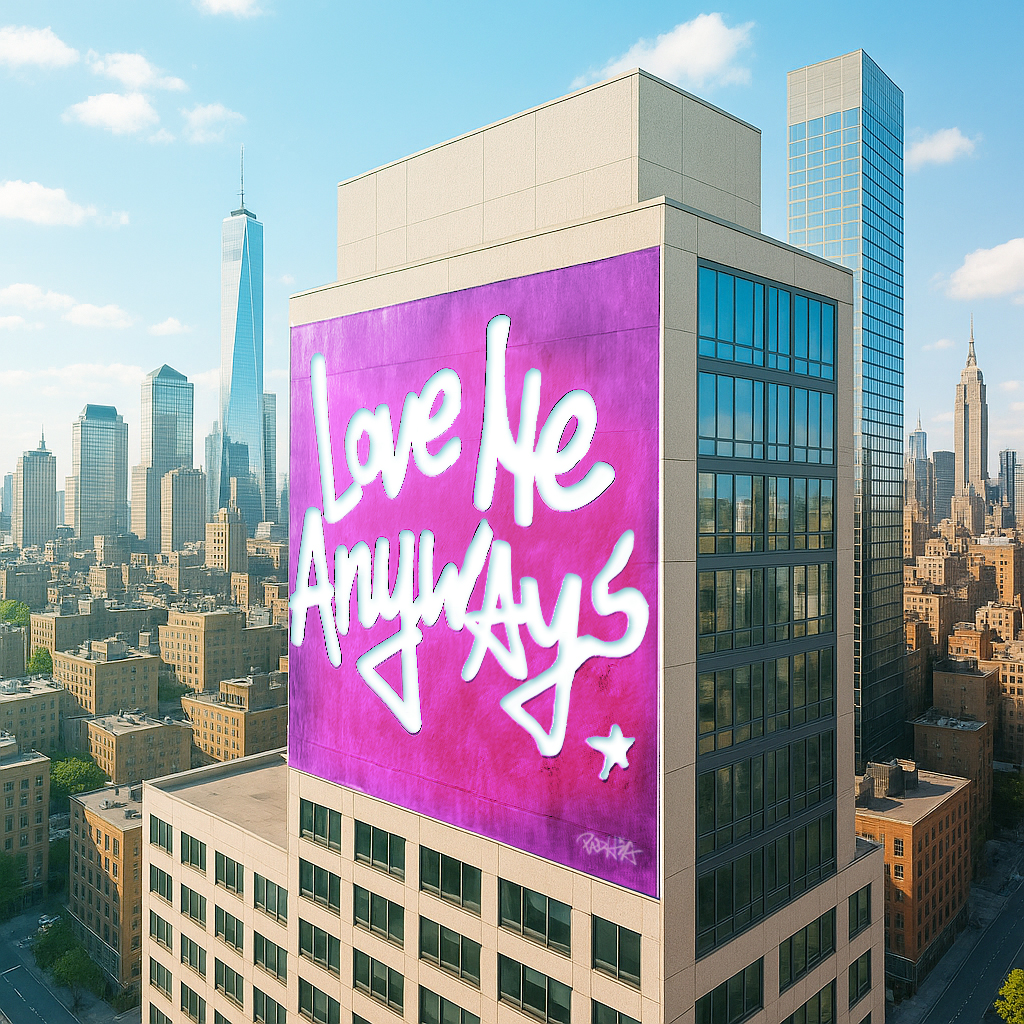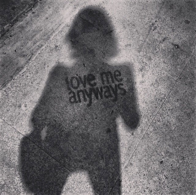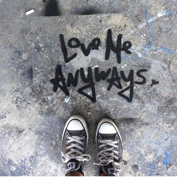 Love Me Anyways is a thought initiative created in 2015 in Los Angeles, CA, by PADHiA, intended to inspire a shift in how we feel about ourselves and one another. It is expressed through street art, murals, fine art, installations, and apparel. It is also a worldwide storybook—a living collection of stories from people across the globe, unfolding through sharing confessions, intimacies, deeper truths, proclamations, or humorous self-reflections, all ending with the words: love me anyways.