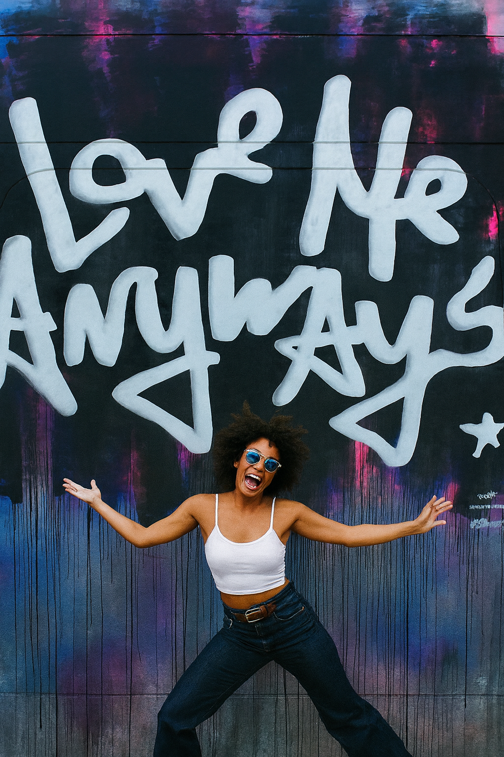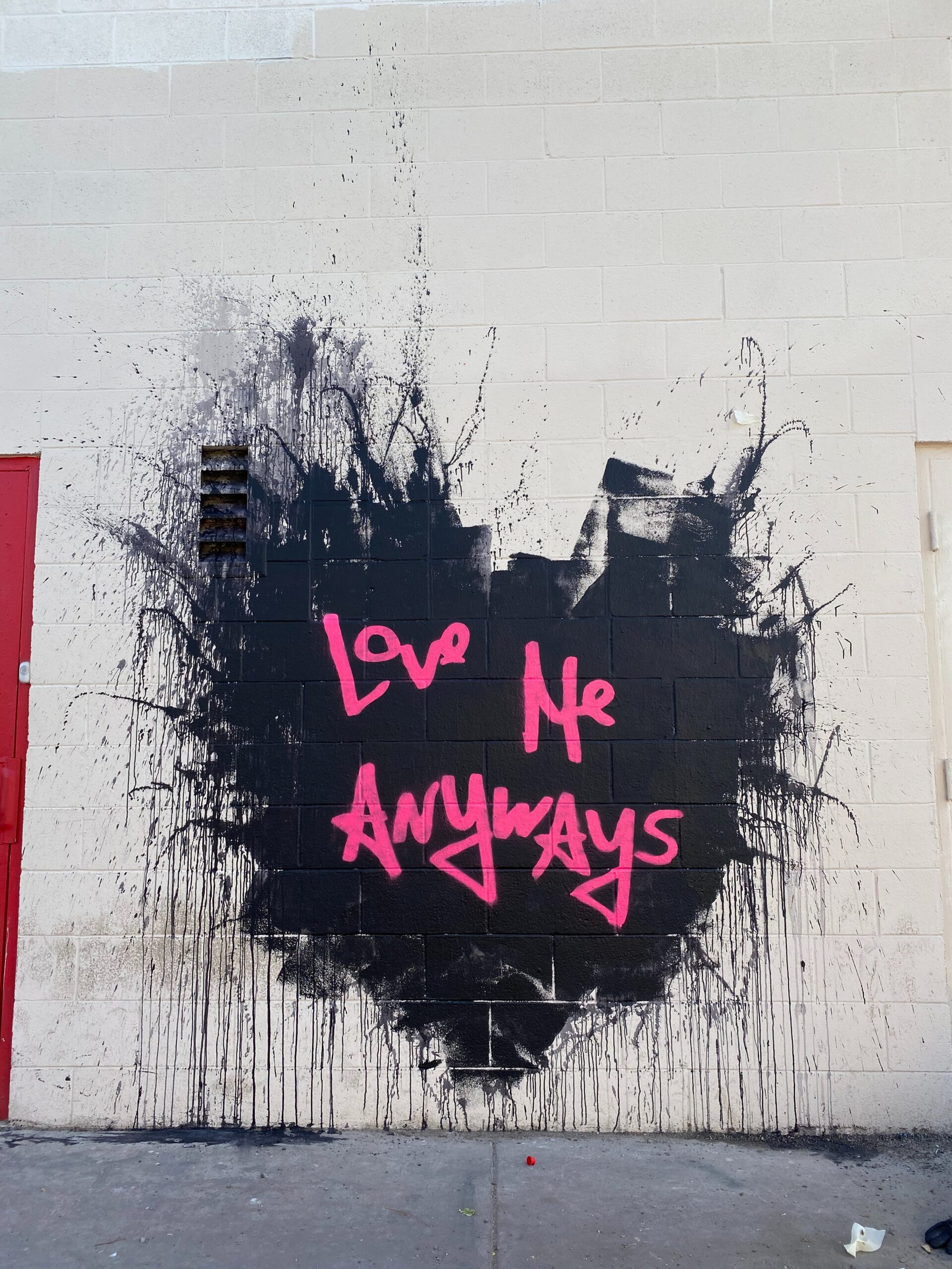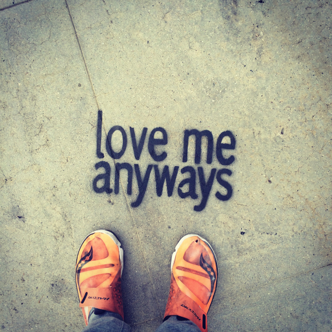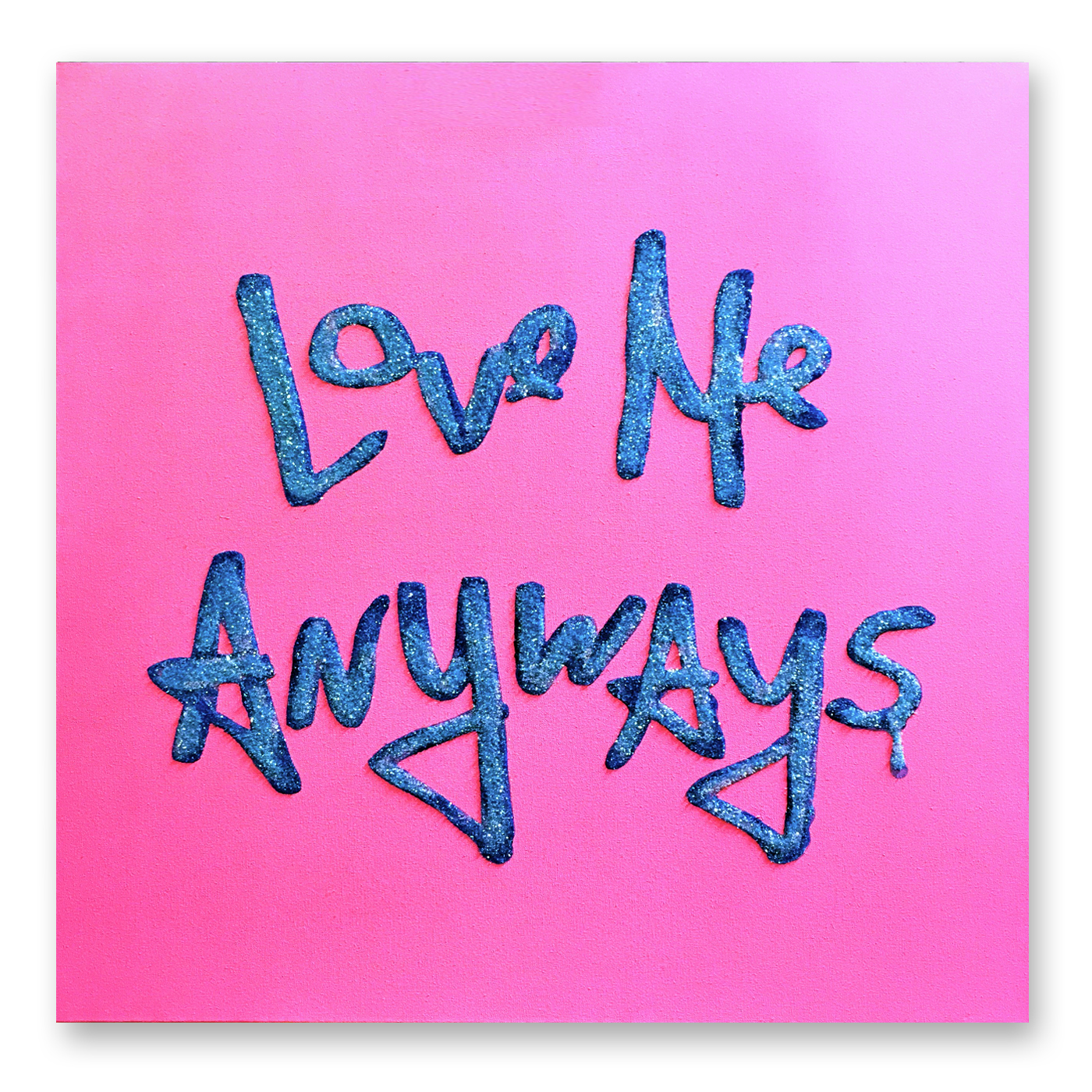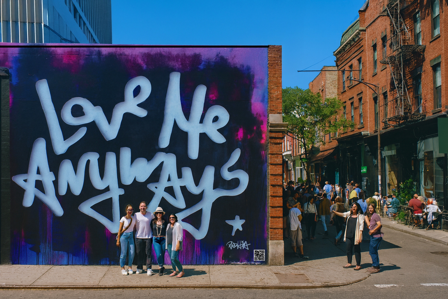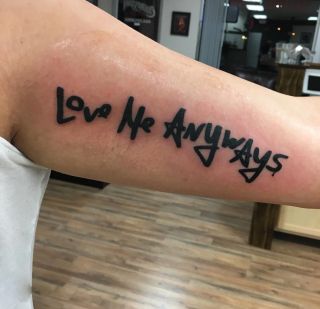 Love Me Anyways is a thought initiative created in 2015 in Los Angeles, CA, by PADHiA, intended to inspire a shift in how we feel about ourselves and one another. It is expressed through street art, murals, fine art, installations, and apparel. It is also a worldwide storybook—a living collection of stories from people across the globe, unfolding through sharing confessions, intimacies, deeper truths, proclamations, or humorous self-reflections, all ending with the words: love me anyways.